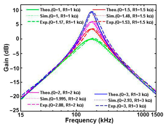 The measured magnitude responses of the VBP2 with different Q values by varying R1 while maintaining fo.