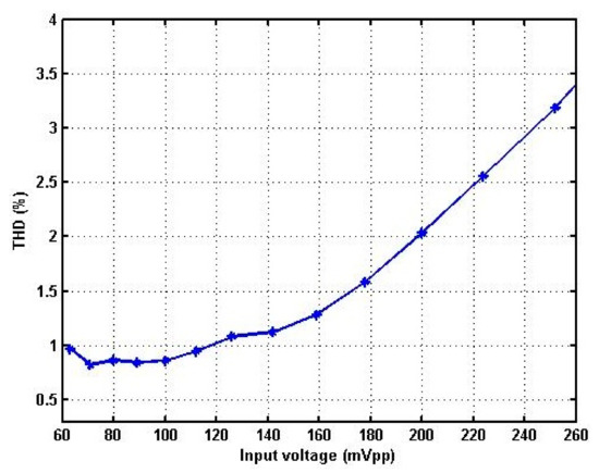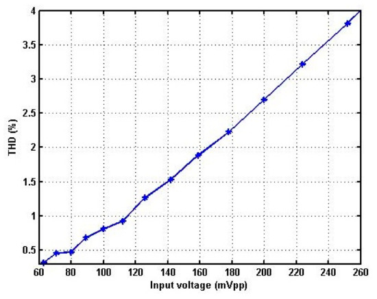 To evaluate the performance of the proposed isomorphic circuit, the total harmonic distortion (THD) and the intermodulation distortion (IMD) of the isomorphic circuit were measured. The THD is defined as the ratio of the sum of the powers of all harmonic components (except the fundamental frequency) to the power of fundamental frequency. The IMD is defined as the two-tone test signals of different frequencies mixed together to form an additional signal at the excitation frequency. The THD and IMD can be expressed as follows [26,27]: