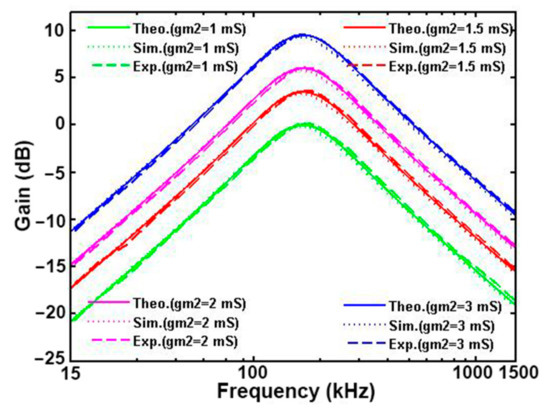 From Equations (28)–(31), the NBPF parameters of fo and Q have orthogonal tunability, and the passband gains are independently adjustable by gm2 without affecting the NBPF parameters fo and Q. Note that the resistors R5 and R6 in Equation (31) can independently achieve a wide range of NBPF adjustable passband gain without affecting the NBPF parameters fo and Q.