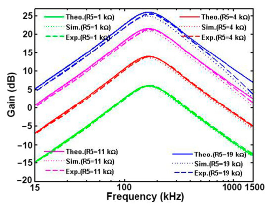 The theoretical, simulated and measured results of the electronic amplitude adjustable NBPF voltage gains at a voltage output of VBP5.