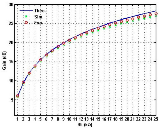 The experimental results of the Vo6 voltage gain when R5 was varied.