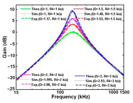 The measured magnitude responses of the VBP5 with different Q values by varying R4 while keeping fo.