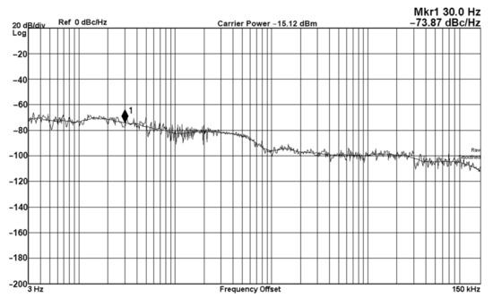 The measured phase noise performance of the VM QSO at the Vo5 output terminal.