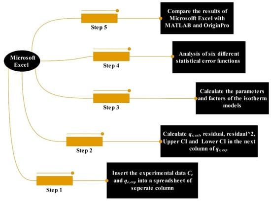 Microsoft Excel was used as a tool for the determination of nonlinear isotherm models and error functions via Windows 10 and Microsoft 365 2020 on PC. The experimental data were entered manually into an Excel sheet operating the graphical data of the isotherm models. Statistical analysis was also performed and compared to that of MATLAB and OriginPro via the formulated algorithm that follows [37,38,39]. The steps of the operation are shown in Figure 1.