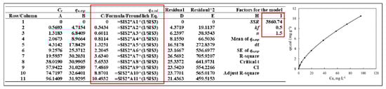 The following step demonstrates how to solve the experimental data of basic dye (methylene blue as a model substrate) loaded onto magnetic nanosorbent in the Microsoft Excel spreadsheet using six isotherm models and seven statistical error functions as mentioned in Section 2.1 and Section 2.2, respectively. Table 2 shows the formulas of factors for the model, the statistical analysis results and the calculated excel codes/formulas. In Table 2, the Freundlich isotherm model was used as an example model to elucidate how to solve the isotherm model via the Microsoft Excel solver spreadsheet-based program. The other isotherm models as mentioned above in Section 2.1 can be applied using the procedures as described below.