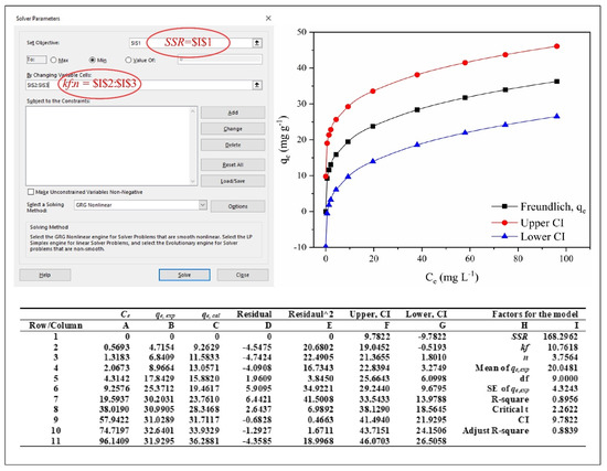 Hence, the Solver function from the Tools menu of Microsoft Excel was needed to fit the experimental data of the nonlinear isotherm model regression analysis as displayed in Figure 3.