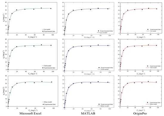The comparison of three-parameter isotherm plots from a Microsoft Excel-based program, MATLAB and OriginPro.