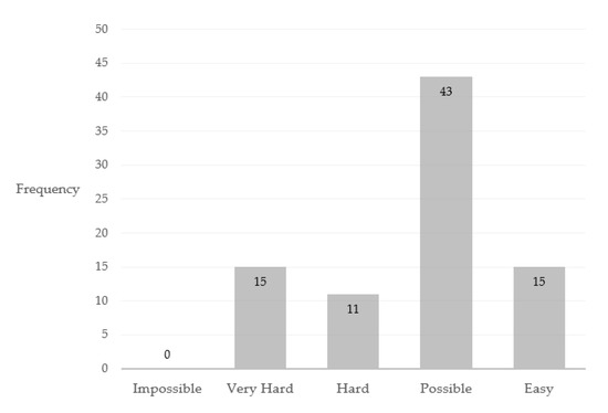 Table 1 shows the frequencies and percentages of answers to our survey. Regarding the complexity of taking an intraoral photograph, 43 (51.2%) patients answered that this procedure was “possible”, and 15 (17.9%) patients answered “easy” (Figure 1). The greatest advantage identified by patients in favor of this technology was the ability to remain at home, while the absence of physical contact was regarded as the greatest disadvantage. For question 22, 62 (73.8%) patients declared that they were interested in the use of a tele(oral)medicine service. For question 23, 16 (19.1%) patients showed a level of interest in a new tele(oral)medicine service defined as “null”, while 6 (7.1%) patients had a “low”, 37 (44.0%) a “medium”, 15 (17.9%) a “high” and 10 (11.9%) a “very high” level of interest. Furthermore, 41 (48.8%) participants declared that they preferred this type of visit to a conventional odontostomatological visit (Figure 2).