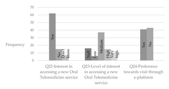 The most interesting result from our survey was that a high percentage of participants (73.8%) declared that they were interested in using a new tele(oral)medicine service. This result was also in line with other studies in the specialist literature. Peacock et al. highlighted that 80% of the patients in their study who were affected by Parkinson’s disease would likely use TM for follow-up appointments [19]. Similarly, Valikodath et al. interviewed 97 patients to evaluate their attitude towards TM, and 66 (68%) participants affirmed their willingness to participate in televisits [20]. Abdulhai et al., through interviewing 129 patients at Akron Children’s Hospital Paediatric Surgery and Gastrointestinal Clinic, reported that 115 (89.2%) participants were amenable to telemedicine for routine follow-up visits [21].
