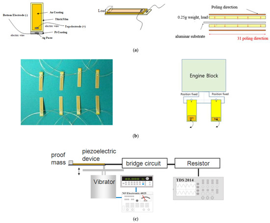 Geometry of piezoelectric cantilever-type generator and its arrangement. (a) Geometry; (b) Piezoelectric generator; (c) Measurement of piezoelectric generator.