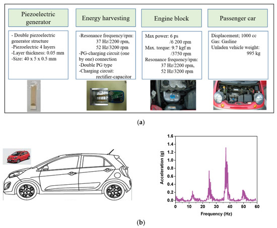 Schematic illustrations of the piezoelectric generator, its employment in the engine block of a small passenger car, and acceleration–frequency relationship of the engine block. (a) Specifications of piezoelectric generator, energy harvesting system, and engine blocks of the passenger car investigated in this study; (b) Schematic illustration of the passenger car and acceleration–frequency relation of the engine block (23~28 Hz: 1400~1800 rpm, 34~40 Hz: 2000~2400 rpm, 48~54 Hz: 2900~3300 rpm).