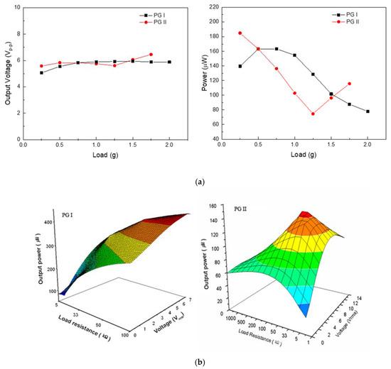 Output voltage and power of piezoelectric generator as a function of payload. (a) Output voltage and power versus load at 37 and 52 Hz; (b) Output power–voltage–load resistance of PG I at 37 Hz and PG II at 52 Hz.