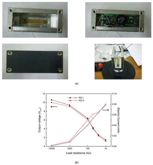 Figure 4 shows the system block, consisting of a single piezoelectric generator and charging circuit, and its measurement. Figure 4a contains photos showing the attachment of a piezoelectric generator onto the metal block, the positioning of an electric charging circuit inside the block, encapsulation of the block with an upper cover, and the measurement of a piezoelectric generator installed on the electromagnetic shaker. Figure 4b shows the output voltage and generated current of piezoelectric generator I (PG I) and piezoelectric generator II (PG II), operated at 37 and 52 Hz, respectively. Both generators have a maximum peak-to-peak voltage of 6 V under a resistive load of 100 kΩ at vibrations of 37 and 52 Hz, along with the creation of 0.04 mA current. From the voltage and current results, both generators could be calculated to have a maximum power of 0.12 mW. The optimum condition and performance of the PGI and PG II are listed in Table 3. Consequently, in order to acquire electric power in a relatively broad vibration condition ranging from 2000 to 4000 rpm, two generators were installed onto the metal block, along with an electric charging circuit and LCD display. The LCD display was attached for the direct observation of power generation without any additional connection.