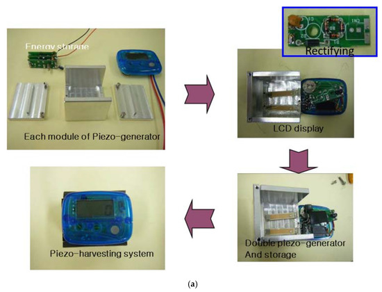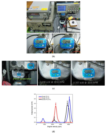Figure 5 shows each component, consisting of a piezoelectric generator, charging circuit, and display. The whole assembly process is shown in Figure 5a. Then, measurement of the assembled harvesting block was observed, as shown in Figure 5b. The power of 0.181 and 0.248 mW was observed in accordance with a vibration acceleration of 1 g (2200 rpm) and 1.2 g (3200 rpm), respectively. Figure 5c shows the installation of a piezoelectric harvesting system on the engine of a small car. Two images show the output power of 0.038 and 0.357 mW when the car runs with an engine velocity of 2200 and 4000 rpm, respectively. Figure 5d shows the relationship between the output power and engine velocity in the car. In a narrow range between 2200 and 3200 rpm, power generation was detected. However, no energy was stored in the harvesting block when the car ran in the other rpm condition. The generated power corresponds with 52% of that in the single piezoelectric generator operated in the car engine. When the system with a double piezoelectric generator was compared to the ones with a single piezoelectric generator, the rpm condition corresponding to the maximum output was somewhat different. The maximum rpm of a system with double piezoelectric generators was slightly shifted to the lower side. This may be the effective payload change in the harvesting system. The rpm or resonance frequency of PGs is affected by the effective stiffness and effective mass or payload.