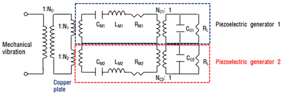 Piezoelectric-type power generation devices are dependent upon the vibration amplitude and frequency. The cantilever-type piezoelectric device exhibited a significant power drop due to a small deviation in frequency. A method to store considerable power is to design a geometry structure to possess several resonant frequencies. As an example, we designed and fabricated the two cantilever generators, which have different masses, showing several resonant frequencies. The system investigated in this study can be considered with a simplified electrical circuit model, as presented in Figure 6 [24]. The interesting characteristics of the piezoelectric device are that the two piezoelectric generators are parallel-connected in the electrical equivalent model. The equivalent circuit model for the device can be thought of as two piezoelectric elements that are assembled back-to-back, similar to the multilayer piezoelectric transformer and other cases [24,25]. This model is only valid in a certain range of resonances. These devices are connected to each other by an ideal device representing the mechanical coupling between the two generators. To estimate the simplified resonant frequency, the equation of a single piezoelectric generator was used. The resonant frequency of the cantilever device was calculated by Equation (2) [26].