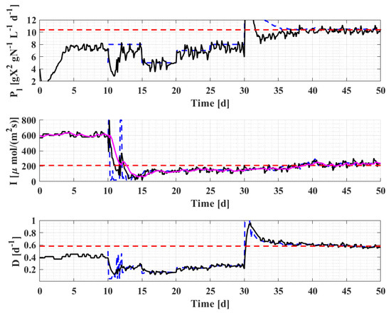 Time evolution of productivity , incident light I, and dilution rate D following SOP and ESC (red: optimal values; blue: estimated references; black: trajectory; magenta: ).