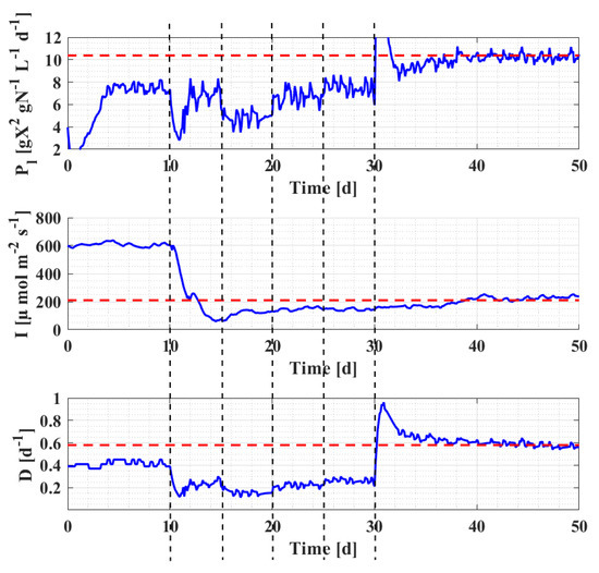 PPC controller performance: Time evolution of productivity , incident light I, and dilution rate D following SOP and ESC (red: optimal values; solid blue: PPC; The SOC step changes are indicated by the vertical dashed lines.