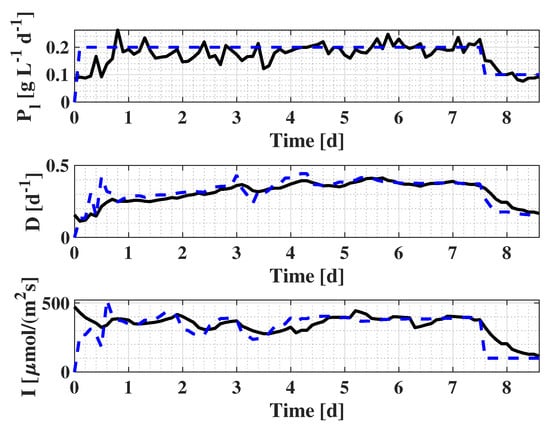 Time evolution of productivity, dilution rate and light intensity during the experimental validation of the SSC method. Dashed lines, calculated references; continuous lines, measured productivity and SSC computed inputs.