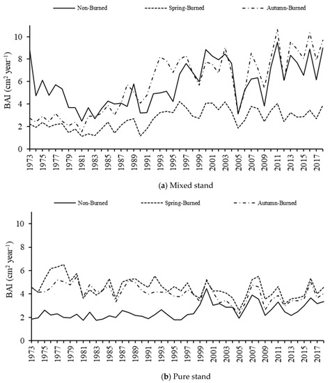 Comparison of annual trends in mean basal area increment (BAI) in (a) the mixed stand and in (b) the pure stand. Unburned plots (solid line), spring-burned plots (dashed line) and autumn-burned plots (dotted line). Spring burning was conducted in May 2016, autumn burning was carried out in November 2016.