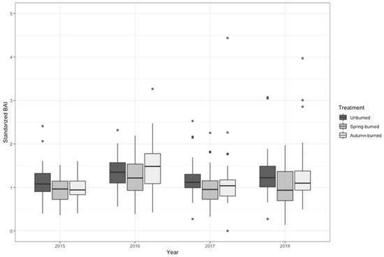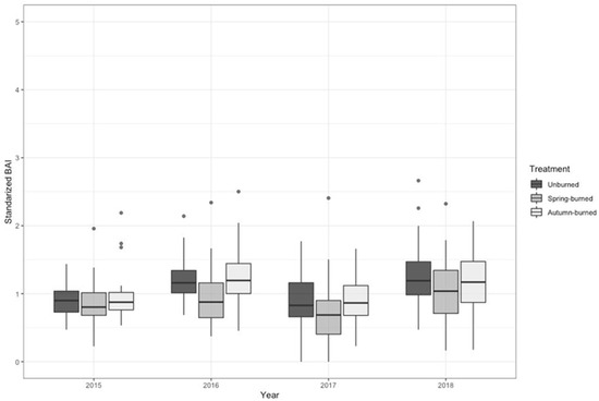 Box plot showing the differences in standardized BAI in the mixed stand. Spring burning was conducted in May 2016, autumn burning was carried out in November 2016.