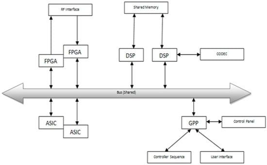 On the other hand, the DSP is a microprocessor, of which the architecture was built specifically to support number-crunching for signal processing applications. A microcontroller is used to configure various components in the system and to interface with the control panel. The FPGAs provide the system’s glue logic, as well as interfaces with the system’s devices. A single shared bus is used by all PEs to communicate with each other and all the combined PEs are referred to as a SoC. In this model, all the components that need to interact with each other directly were connected using dedicated interconnects and they communicated via inter-processor communication. A digital signal processing embedded communication system that interfaces a digital design with the RF end is shown in Figure 18.