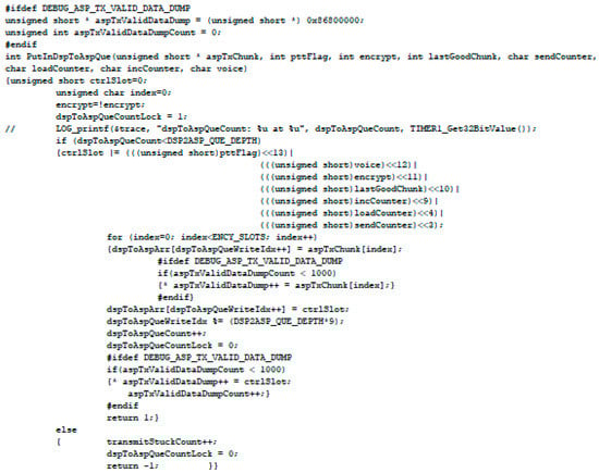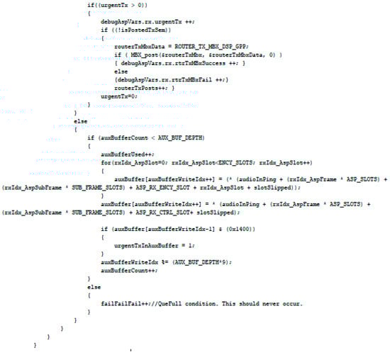 PutInDspToAspQue() function is used whenever data is transmitted through a serial port, shown in Figure 19, and the routerTxMbx mailbox is posted whenever data are received via a serial port in the SDR embedded system, shown in Figure 20.