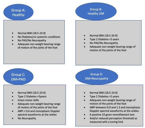 Inclusion criteria for the 4 groups of recruited participants are listed in Figure 1. Adults aged between 40 and 80 years were invited. Exclusion criteria for all groups included a history of alcohol abuse; history of /or current foot ulceration; history of lower extremity surgery, including hip, knee, ankle or foot, or severely pronated/supinated feet; leg length discrepancy; foot pain and deformities; use of walking aids; problems of cooperation, including eyes or cognitive disorders; and other significant medical co-morbidities.