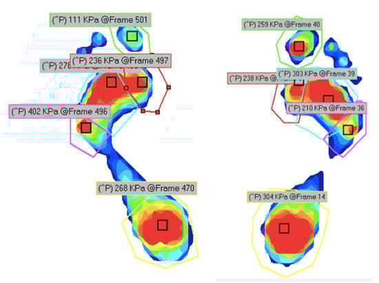 Indeed, pressures ranging from 200 kPa to 1000 kPa [8] have been proposed as predictive thresholds for ulceration in persons living with DM; specific values include 588 kPa [9] and 335 kPa [10]. It was also suggested that plantar pressure greater than 700 kPa is the threshold in screening patients who are at risk of developing diabetic foot ulceration [11]; it was also suggested that in the presence of a pre-ulcerative lesion, lack of in-shoe peak pressure below 200 kPa and “high barefoot dynamic peak plantar pressure” are risk factors for a pressure-related plantar ulcer [12].