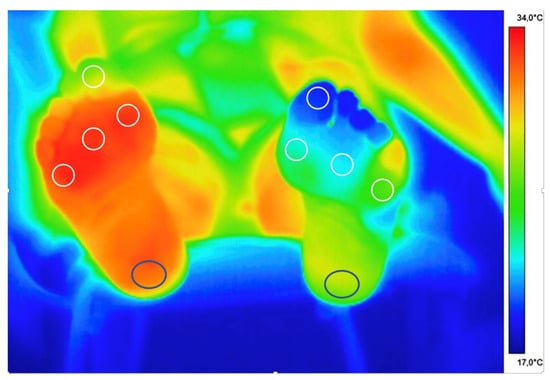 In order to extract temperatures from the soles of the feet, mean temperatures were extracted from the hallux, medial, central and lateral forefoot and heel (Figure 3). These mean temperatures were automatically calculated by the thermographic analysis software by dividing the temperature at each pixel in the region of interest by the number of pixels. These were selected from locations pre-determined in another study that showed these locations as being reliable and repeatable for thermographic temperature recording and evaluation [22]. The Statistical Package for Social Sciences (SPSS) program (IBM) version 27 was utilized for the statistical analysis and for correlating pressure and temperature data.
