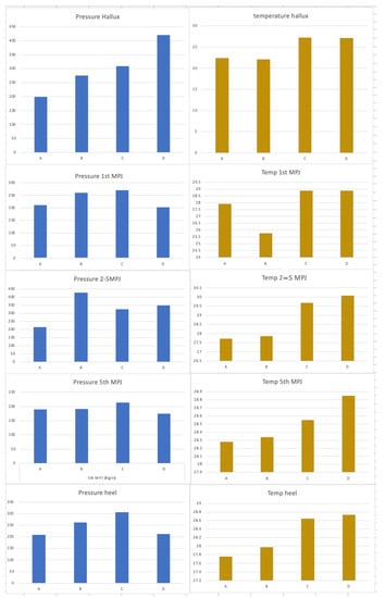 This preliminary investigation aimed to explore whether a correlation between pressure and temperature in different regions of the foot exist in different categories of participants following 15 min of walking. The results from this study could serve as an initial insight into the possibilities of developing a potential clinical test that fuses these two parameters in order to produce a more valid risk predictor than by using temperature or pressure measurements on their own. This fusion of pressure and temperature has been termed the “Thermo-pressure” concept.