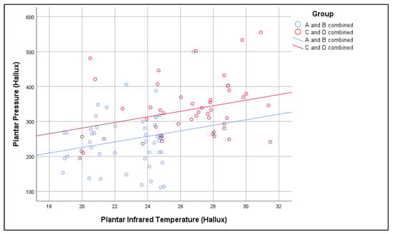 The scatter plot (Figure 5) demonstrates the relation between plantar pressures and plantar infrared temperature for the Hallux region, of Groups A and B combined vs. Groups C and D combined. It illustrates that higher pressures relate to higher temperatures and that the plantar pressures and plantar infrared temperatures of Groups C and D combined are higher when compared to Groups A and B combined. Graphically, both lines follow an upward trend, indicating that both groups have a positive correlation coefficient. However, one can notice that the trend line for Groups C and D combined is slightly steeper than for Group A and B combined, illustrating that the correlation coefficient is significantly different from 0.