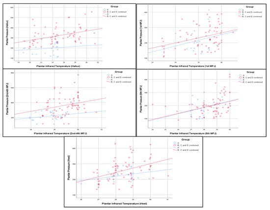 In the second statistical test, the two groups were divided into a healthy group (Group A) and a diabetes group (Groups B,C,D). Table 3 demonstrates that, whilst there are only two positively correlated (p < 0.05) regions of interest (ROIs) in Group A, all ROIs in Groups B, C and D combined demonstrate a positive correlation. Figure 6 displays a scatter plot exhibiting the relation between plantar pressure and plantar infrared temperature in the regions of interest.