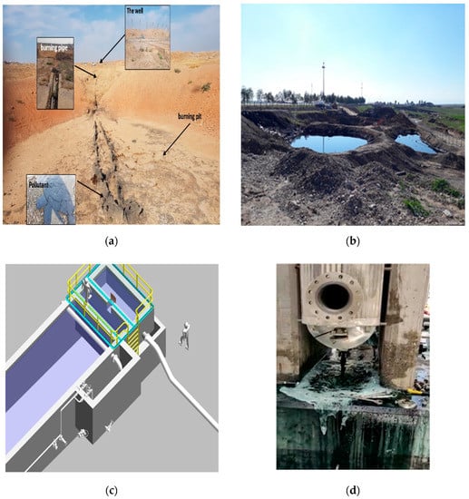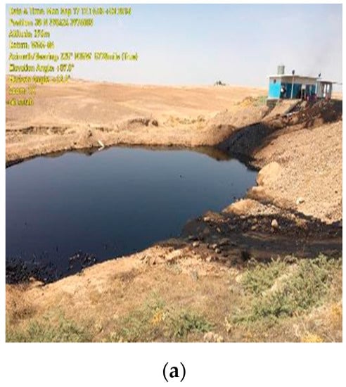 - The absence of a closed drain system in the facilities (including pumps, equipment, pipes, and valves) frequently causes various oil leakage accidents, which can cause severe pollution to the surrounding soil, as shown in Figure 1d. These problems can be controlled through the use of close drain systems linked to a piping system connected to a particular basin for this leakage. Unfortunately, this system is not currently in use at the Khurmala oil station.