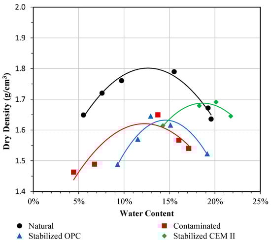 Compaction curves of natural, contaminated, and treated (CEM II and OPC) soils.