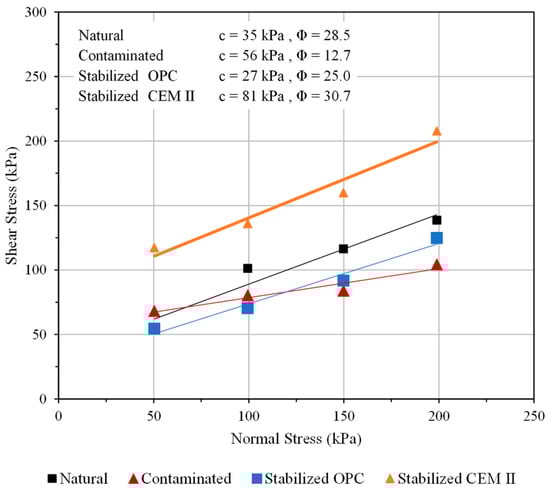 Direct shear test results of natural, contaminated, and treated (CEM II and OPC) soils.