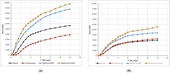 Stress versus vertical displacement for (a) un-soaked and (b) soaked samples.