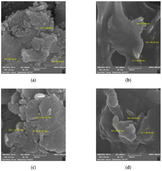 Figure 7a–d and Figure 8a–d illustrate the geometric arrangement for the natural, contaminated, and treated soils, respectively. In natural soil fabric, the diameter in the singular grains can be observed. However, it is not possible to distinguish individual floccules in these micrographs, as indicated in Figure 7a. Subsequently, the morphological shape of the natural soil, as shown in Figure 8a, indicated the appearance of burrs in the soil grains, confirming its non-coated properties.