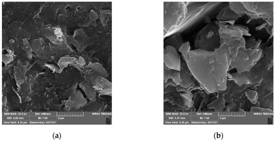 Crude oil firmly coated the singular soil particles via hydrogen bonding and van der Waals forces. As a result, it was shown in the form of a dense-packed structure with almost no visible voids, as shown in Figure 7b, since the lining oils created a water-resistant layer that blocked the voids, causing a reduction in permeability. Moreover, in the photomicrograph of Figure 8b, the surface of the contaminated soil appeared as one flock with no distinct pore spaces, indicating that it was filled with oil.