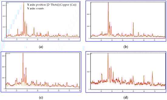 XRD test results for the soil samples are illustrated in Table 8 and Figure 9. The pollutants changed the shape of Figure 9b, when compared with Figure 9a; silicon oxide and calcium carbonate values were increased in the polluted soil sample, when compared with the normal soil sample (Table 8). Furthermore, calcium aluminum silicate also increased, while silicon oxide and calcium carbonate decreased after both treatment methods. Additionally, treatment using CEM II is shown in Figure 9c. Using OPC for the treatment of the polluted soil sample affected the soil components, as shown in Figure 9d. Values of aluminum calcium silicon, magnesium aluminum silicate, iron silicate hydroxide, magnesium dialuminium disilicide-U1, and sodium aluminum silicate hydrate increased in the treated samples (Table 8). The obtained results shown in Table 7 are in coincidence with the illustration of XRD results. The variation of values in Figure 9a–d agrees with the obtained results in Table 8. The present results agree with the published work of Aziz [].