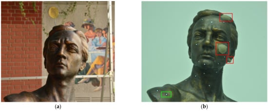 Sculpture that is 3D digitized: (a) without built-in error; (b) with built-in error (marked with red squares) and reference points for 3D scanner (marked with a green square).
