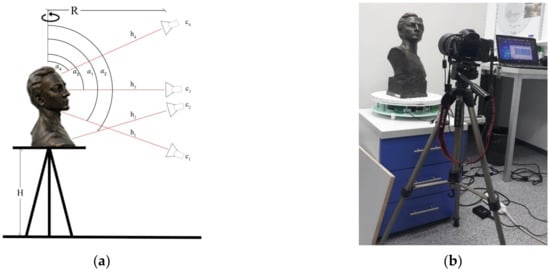 The final camera distance was set at 0.5 m, so a compromise was made between field of view (FoV) and depth of field (DoF). To provide the required level of coverage of all surfaces of the sculpture with photographs, the photographs were taken in four different stripes in height, with an increment of 20°. In the face region, the turning increment was less than the predicted 20°. In Figure 2, four camera positions, denoted C1,…, C4 are shown, and the distances along the optical axis from the camera to the sculpture are indicated, respectively, by h1,…, h4. The first stripe is also the lowest stripe in which the camera was placed. The second stripe was set up to photograph the pedestal. At the third level, the camera is positioned at the level of the face with an optical axis of 90° relative to the axis of rotation, and at the fourth and highest level, the camera is positioned above the sculpture, so that the optical axis closed a sharp angle (𝛼4) with the axis of rotation of the turntable. Additional photographs in the region of the face and the crown of the head were taken to gather as much information as possible from the surface of the object. After the photographing, 100 photographs were used to create the 3D model in the AgiSoft Metashape software []. The calculated parameters for photogrammetry surveying are shown in Table 1.