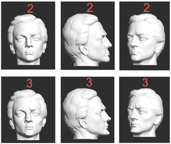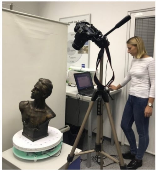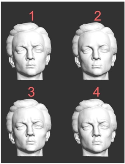 The sculpture shown in Figure 1 was 3D digitized using two non-contact methods: photogrammetry and fringe projection. First, the sculpture was 3D digitized without added masses of clay. In this way, the data on the original form/appearance of the work of art were collected. After the sculpture was scanned in both ways, the curator/sculptor from the Gallery of Matica srpska added clay to the parts of the sculpture, namely a lock of hair (on the left side), an earlobe (on the left side), and a cheekbone (on the left side). The masses were added, according to the sculptor’s feeling, to the parts where they would be unnoticeable by an average observer and in an amount that is also unnoticeable by the observer. Namely, part of this research includes a survey of 195 respondents, which is described in Section 4.3. When the masses were added, the sculpture was again 3D digitized, by photogrammetry and structured light. This digitized sculpture was called a sculpture with a digital error. For both types of 3D digitalization, photogrammetry, and 3D digitization with structured light (fringe projection method), we digitized the sculpture to which the markers were glued. Moreover, on the sculpture and on the stand, in some places, the markers were glued at the selected distance, and those defined distances were used to determine the scale and to create a coordinate system.