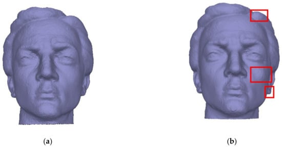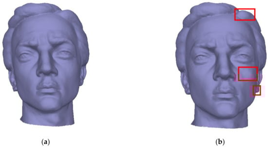 Figure 4 shows the results of the photogrammetric survey. While Figure 4a shows the original model, Figure 4b shows the model with the built-in digital error where the red rectangles indicate the parts of the face to which the clay was added.