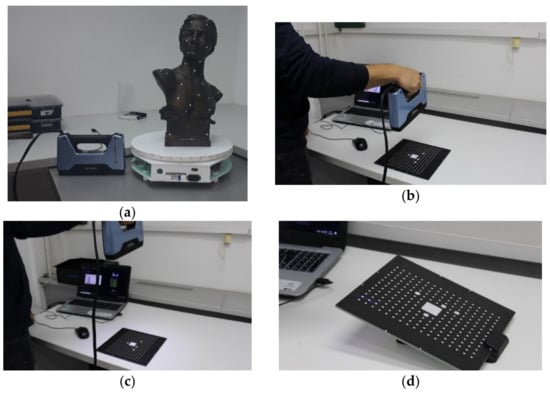 The precision of this scanner for Handheld HD Scan mode goes up to 0.05 mm [,]. The 3D models obtained by using 3D scanners are with high accuracy, but the accuracy and repeatability of the scanner are essential []. After connecting the scanner to the computer via USB and starting the software, the calibration process (Figure 5b–d) was performed first. When calibration is finished, the software closes the calibration window automatically and enters the scan mode selection page.