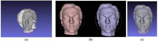 When the models were imported, in order for their geometry to be compared, it was necessary to align their positions and orientations. This step was done using the Align option in the MeshLab software. In this/our case, the reference model is the model obtained by digitizing the original sculpture and the position, and orientation of the second model is aligned with the reference model. When the mentioned model was declared the reference model, and the option of aligning the model based on key/reference points was chosen, it was necessary to set key points on both models (Figure 8b). The key points are placed on the characteristic parts of the face. The reference points must not belong to the “sculptural error” zones. It should be emphasized that the points on the basis of which the alignment of the model is made are arbitrarily set/chosen by the user and that the precision and accuracy of the final result depends on the accuracy of the given positions of the same points on both models. The software recognizes key points and performs their pairing on the models based on the index, that is, the ordinal number of the point according to which they are assigned on the model. For example, if a point with index 0 is in the middle of the upper lip on the reference model, the point with the same index must also be in the same position on the model being compared to the reference, as shown in Figure 8b. The process of setting key points is done manually.