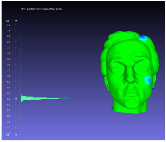 The result of the vertex quality for the meshes obtained using the 3D scanning technique is illustrated as the visual representation of the values in Figure 9. The visual representation of the histogram values shows that the details on the models mostly match and do not differ as is illustrated by green values. The green values in the histogram show that the deviations between the compared models are in the interval (−0.1, 0.2) mm; with the deviation equal to zero, there are the largest number of points. The maximal deviation between the models (based on the vertices distance) is about 3 mm, in particular, −1.5 mm for the concave parts of the model, and 3.3 mm for the convex parts. The deviation on the convex parts is represented by blue values and it can be seen that it is located in the parts where clay masses were added to the sculpture.