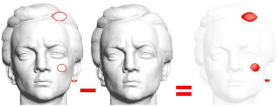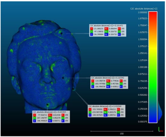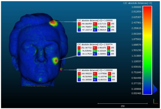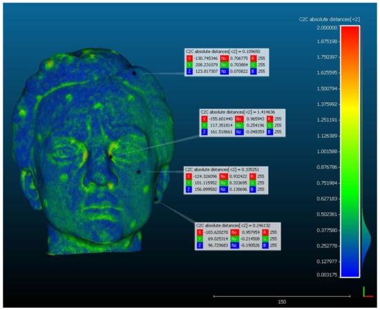 We used two techniques to digitize the sculpture: photogrammetry and structured light scanning. In the first case, the original sculpture obtained by photogrammetry was compared with the sculpture with a built-in error that was also digitized by photogrammetry; in the second case, the original and the sculpture with a built-in error were compared when both 3D models were obtained by scanning; in the third case, the original sculpture whose 3D models were obtained in two ways, by photogrammetry and scanning, was compared; in the fourth case, a sculpture with a built-in error whose 3D models were obtained by photogrammetry and scanning was compared. The comparison in CloudCompare software was done using iterative closest point (ICP) algorithm for aligning. The iterative closest point (ICP) algorithm is a method for aligning point clouds that does not require the corresponding elements and has high accuracy [,]. When the point clouds are aligned, the distance of the characteristic point of the model is measured, which is compared in relation to the corresponding point on the reference model.