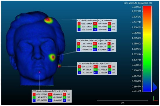 Figure 11 shows the results obtained by 3D scanning (the original model as reference model and the 3D model with a digital error). By comparative analysis of these two models, it was estimated that the absolute deviation has a value of 3 mm. The points that have the largest deviation from the reference model are located in the areas where clay was added to the sculpture, and in these areas the values of the coordinates of three points and the distance from the points on the reference model are 3 mm, 2.742 mm, and 3 mm, respectively. Most of the points have a deviation between 0.1 mm and 0.2 mm. The value of the average deviation is 0.025 mm, while the standard deviation of the model with digital error is 0.226 mm.