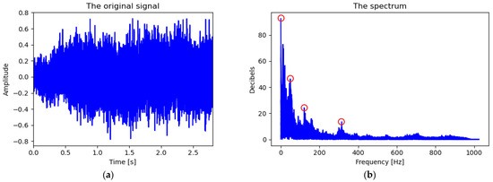 Fourier’s theorem states that any finite sound signal is composed of a set of single-frequency sound waves; namely, the harmonic functions, sine and cosine [28]. The Fourier transform is used to decompose a signal into its individual frequencies, as well as the amplitudes of those frequencies. The result of the Fourier operation is called the spectrum [29]. As can be seen in Figure 2, the achieved results for HVAC show a recorded sample converted to a spectrum.