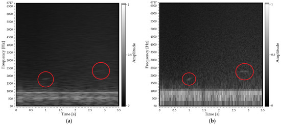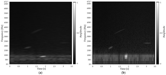 A sample of spectrogram 1 (a) and spectrogram 2 (b), where intensity of EN is damped to −10 dB from the nominal level.